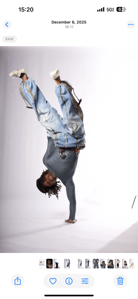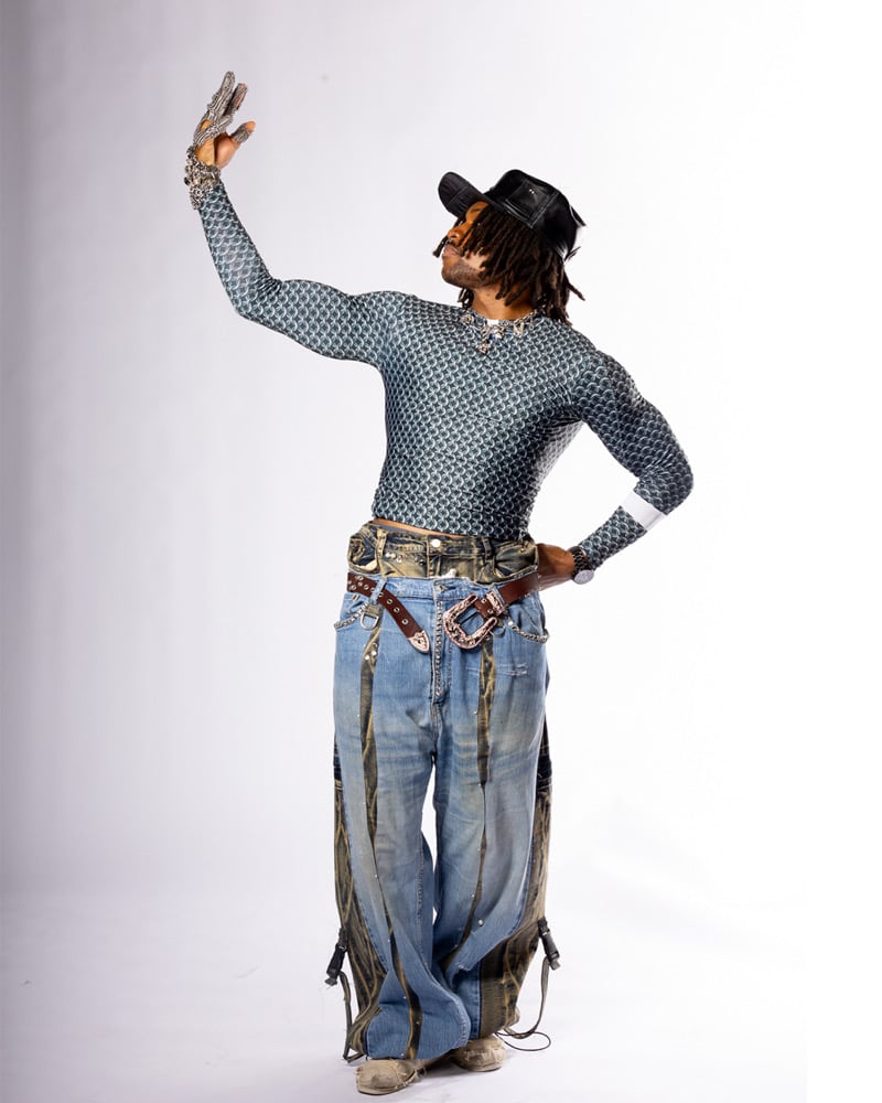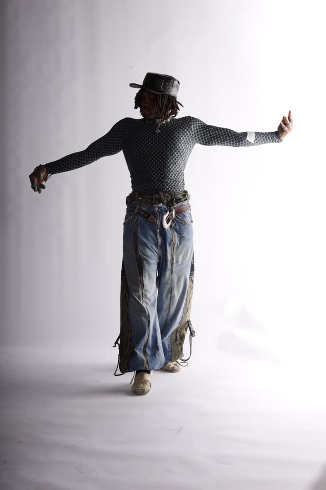 Double waisted double drawstring denim pants, upcycled from thrifted garments, bedazzled, studded, pearled, distressed, and extended. These pants feature drawstrings at the hem, allowing you to convert them to parachute pants, or even wearing them as a wider silhouette. They also come with an adjustable strap that allows you to pull the lower pant upwards, preventing ankle bite.